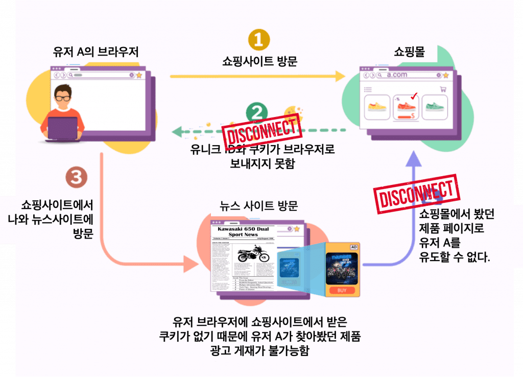 Firefox와 Safari는 이미 추적 쿠키를 차단하고 있고, 구글 크롬 브라우저도 서드파티 쿠키를 2023년에는 기본으로 차단하겠다고 발표했다. 크롬은 점유율이 60%를 넘는 시장 지배적인 웹 브라우저이기 때문에 쿠키 차단에 대한 구글의 입장은 광고 및 마케팅 업계에 큰 영향을 준다. 쿠키 차단으로 인해 기존에 진행되었던 리타겟팅은 불가능해진다. 쇼핑몰 방문/상품 조회 후 뉴스 사이트 방문하는 아래의 Case를 살펴보자. 3rd Party Cookies로 연결되었던 데이터 흐름이 막히게 된다.
